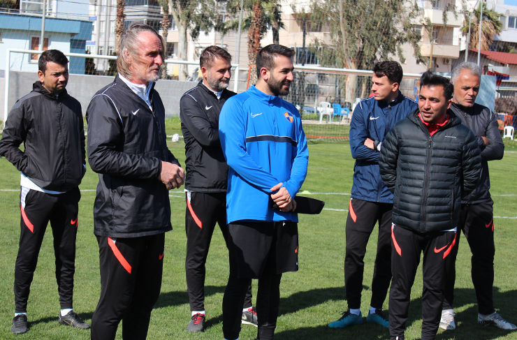 İskenderunspor tesislerinde yapılan çalışmalar öncesinde Teknik Direktör Jan Olde Riekerink, Ertaç Bağcı ile sohbet etti.