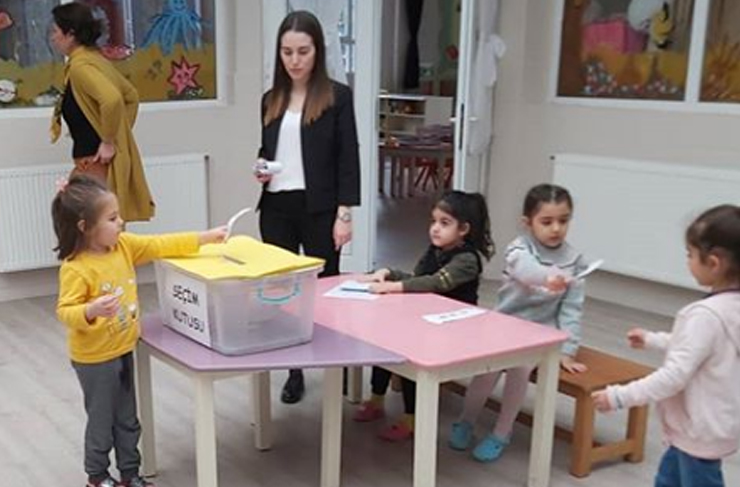 Oylarını kullanan çocuklarımız parmak izini bastılar. Böylece kimlerin oy kullanıp kullanmadığı görülmüş oldu. Ardından tüm anaokulu önünde seçim sandığı açılarak oylar sayıldı. Bildiğiniz üzere okulumuz obeziteyle mücadele konusunda Milli Eğitim Bakanlığından Beyaz Bayrak alarak dengeli beslenme konusuna hassasiyet gösteren bir okul. Bu etkinlik ile de öğrencilerimizin hem demokrasi ve seçimi yaşamalarını hem de kendi seçtikleri yiyecekleri yedikleri için mutlu olmalarını istedik” diye konuştu. (Haber: Meral SADREDİN)