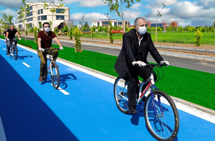 Rektör Prof. Dr. Türkay Dereli, yaptığı değerlendirmede sözlerini şöyle tamamladı; “Kaldırım seviyesinden aşağıda olmak üzere, 3 metre genişliğinde beton zemini mavi renkli ve beyaz çizgili Bisiklet Yolumuz, Çevre ve Şehircilik Bakanlığı’nın hazırladığı Bisiklet Yolu Yönetmeliği’ne uygun olarak yapıldı. Yurt ve eğitim binalarını birbirine bağlayacak şekilde tasarlanan bisiklet yollarımızın eğimi asla %4’ü geçmiyor. Yapımında emeği geçen tüm personelimize teşekkür ediyor, hayırlı olmasını ve sağlıklı günlerde kullanılmasını diliyorum” dedi.