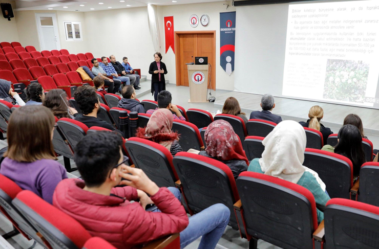 Doğal kaynakları tehdit eden en önemli kirleticiler arasında, ağır metallerin olduğunun altını çizen Doç. Dr. Bozdoğan Sert, kirleticiyi bünyesine alarak ya da toprakta sabitleyerek; zararsız hale getirebilen bitkiler hakkında bilgi verdi. Peyzaj uygulamalarında, çevreyi temizleme özelliği olan bitkilerin daha çok tercih edilmesi gerektiğine vurgu yapan Doç. Dr. Bozdoğan Sert; şehirlerdeki hızlı büyümenin doğaya zarar verdiğini, çatıların hatta balkonların yeşil alan sayıldığı bir dünyada bu alanların çok iyi değerlendirilmesi gerektiğini söyledi. Ayrıca özellikle metal biriktiren bitkilerin, ‘o metalin tekrar doğaya kazandırma özelliğinin’ olduğunu ifade eden Doç. Dr. Elif Bozdoğan Sert, bu bağlamda; İSTE Peyzaj Mimarlığı Bölümü’nün hedeflerinden birisinin de bu bitkilerin kullanım alanını gerek İSTE kampüste, gerekse de İskenderun ve Türkiye’de yaygınlaştırmak olduğunu belirtti.