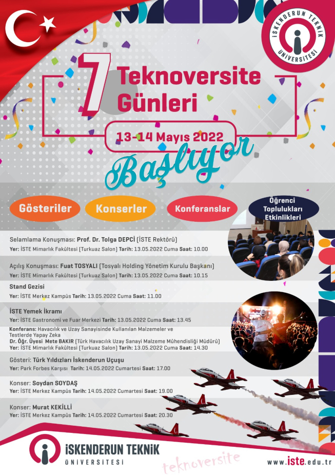 14 Mayıs Cumartesi günü saat 17.00’de Park Forbes civarında Türk Yıldızları İskenderun Uçuşu yapacak. Günün sonunda ise İSTE merkez kampüsünde ünlü sanatçılar Soydan Soydaş ve Murat Kekilli, üniversite gençleriyle buluşup, sevilen şarkılarını seslendirecek.