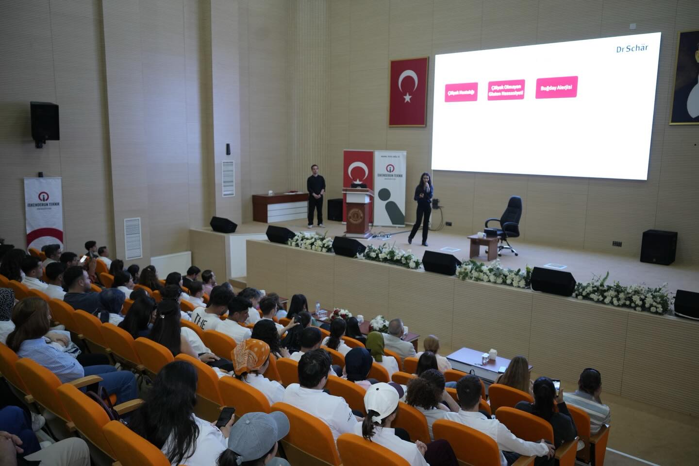 Konuşmasına Turizm Fakültesi yönetimine davetleri ve sağladıkları imkân için teşekkür ederek başlayan Müberra UZUN, Schar firması tarafından hayata geçirilen “Glütensiz Yol Arkadaşım” projesi hakkında katılımcılara bilgi verdi. UZUN, söz konusu projenin çölyak hastalığına yönelik farkındalığı artırmayı amaçladığını belirterek, çölyak hastalarının hem hastalıkları konusunda bilinçlenmesine katkı sağlamak hem de glütensiz ürünlere erişim konusunda çeşitli destek ve yardımlar sunmak amacıyla bazı illerde başlatılan projenin Türkiye genelinde yaygınlaştırılmasının hedeflendiğini ifade etti. Söyleşide ayrıca glütenin ne olduğu, glütensiz beslenmenin temel prensipleri ve çölyak hastalığı ile glüten arasındaki ilişki hakkında kapsamlı bilgiler paylaşıldı. Glütensiz diyetin günlük yaşamda nasıl uygulanabileceğine dair örneklerin de ele alındığı program, öğrencilerin ve katılımcıların yönelttiği soruların cevaplanmasıyla interaktif bir şekilde devam etti.