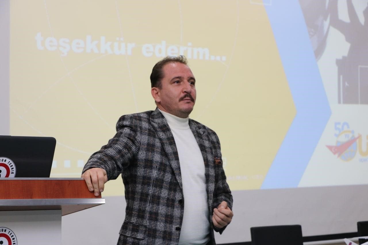 Konferansta, Uçak Teknisyenleri Derneği (UTED) Başkanı Necdet Aksaç, Dünyada ve Türkiye’de uçak teknisyenlerinin mevcut durumu ve raporlarla gelecek tahminlerinin nasıl olduğunu dinleyicilerle paylaştı. Aksaç, öğrencilerin sektörde dünyanın her yerinde iş imkanlarının olduğunun altını çizdi ve öğrencilere bunun için dil yeteneklerini geliştirmeleri, analitik düşünmeleri ve grup çalışmasına uyumlu nitelikler geliştirmeleri tavsiyesinde bulundu.