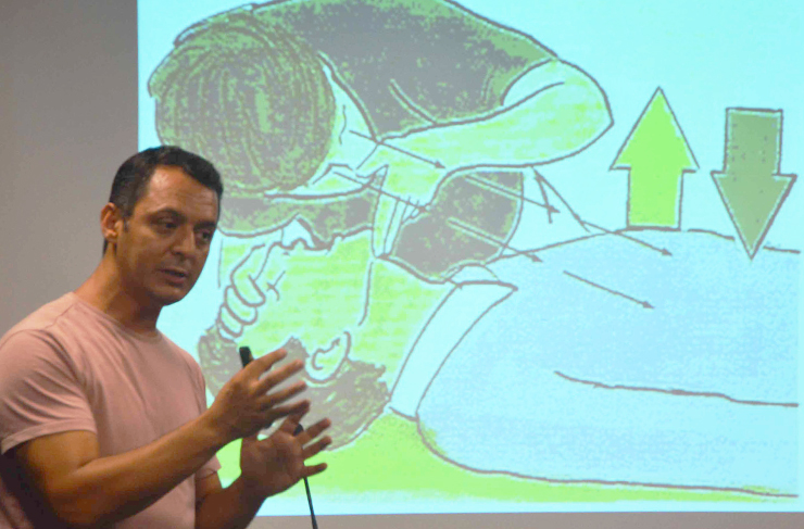 İTSO Personellerine yönelik verilen İlk yardım eğitiminde kalp krizi ve şuur kaybı yaşayan hastalara yönelik yapılması gereken kalp masajı ve suni teneffüs hakkında da detaylı ve görsel materyaller kullanılarak bilgiler veren İlk ve Acil Yardım Uzmanı İş yeri Hekimi Uzm. Dr. Aydın Deniz Karataş, “Özellikle bilinç kaybı olanlarda dil geri kaçarak solunum yolunu tıkayabilir. Hastanın bilinç kaybı belirlenmiş ise ağız içi önce göz ile daha sonra işaret parmağı yandan ağız içine sokularak bir çengel gibi kullanılarak diğer yandan çıkartılmak suretiyle kontrol edilmeli, ardından yabancı cisim varsa bir bez aracılığı ile çıkartılmalıdır. Kalp masajları ve suni teneffüsler ortalama yarım saati bulabilir” dedi.
