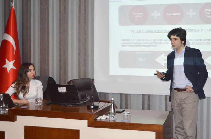 Av. Tuğrul Sevim sine vizyon destekli olarak yaptığı konuşmasında; “Verilerin hukuka uygun işlemesi için tüm şartların birlikte oluşması gerekir. Bu şartlar rıza ve hatırlatma, aydınlatma, amaç ve süre ile sınırlı olmalı, ilkelere uygunluk sağlanmalıdır. Bu kapsamda veri sahiplerinin hakları ise verilerini saklama, silme, anonimleştirme, bilgi güvenliği ihlal ve olay yönetimi sürdürülebilirlik kavramları da veri tabanı ve kişisel bilgilerin korunmasında önemli etkenlerdir” dedi.