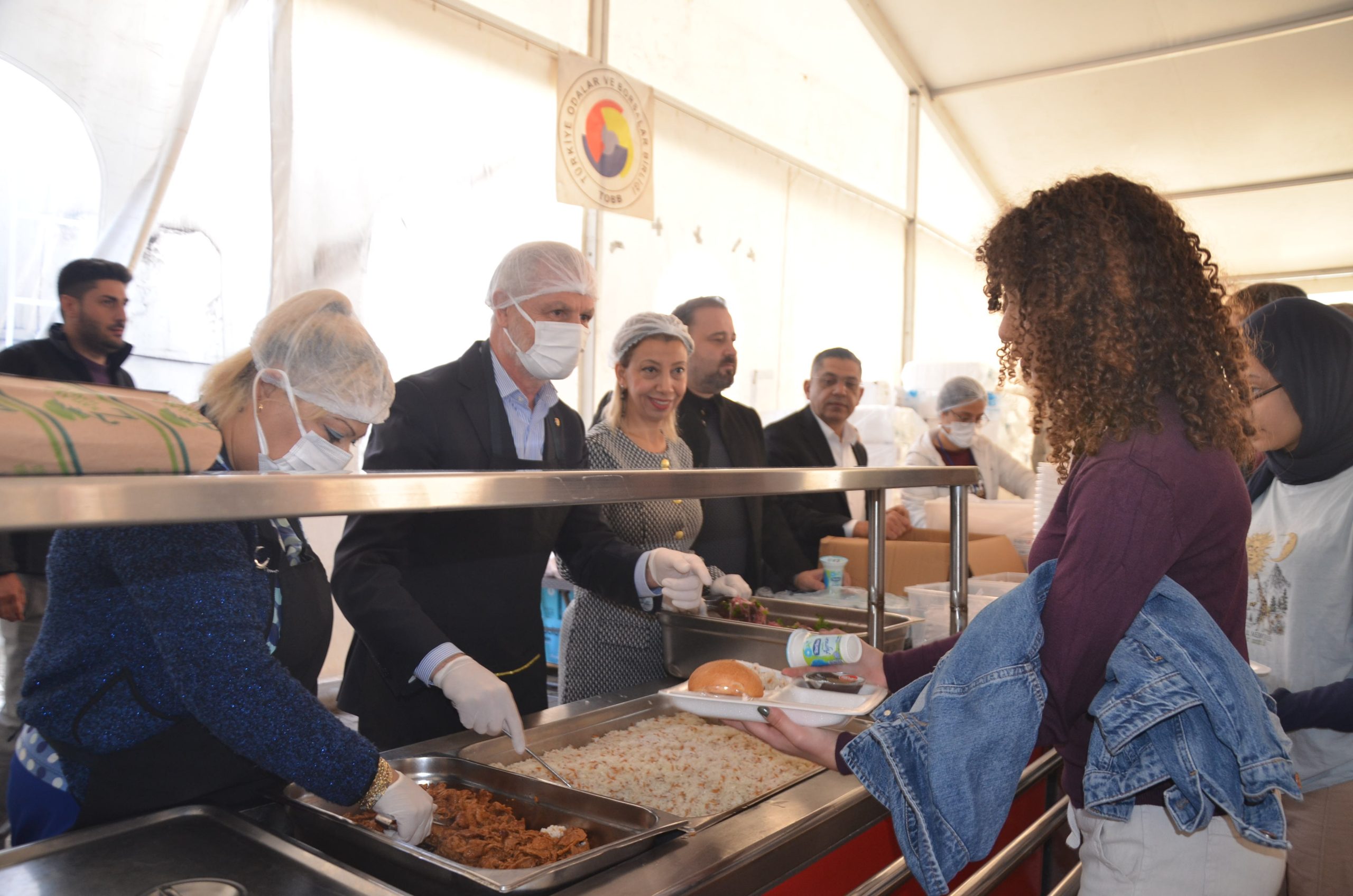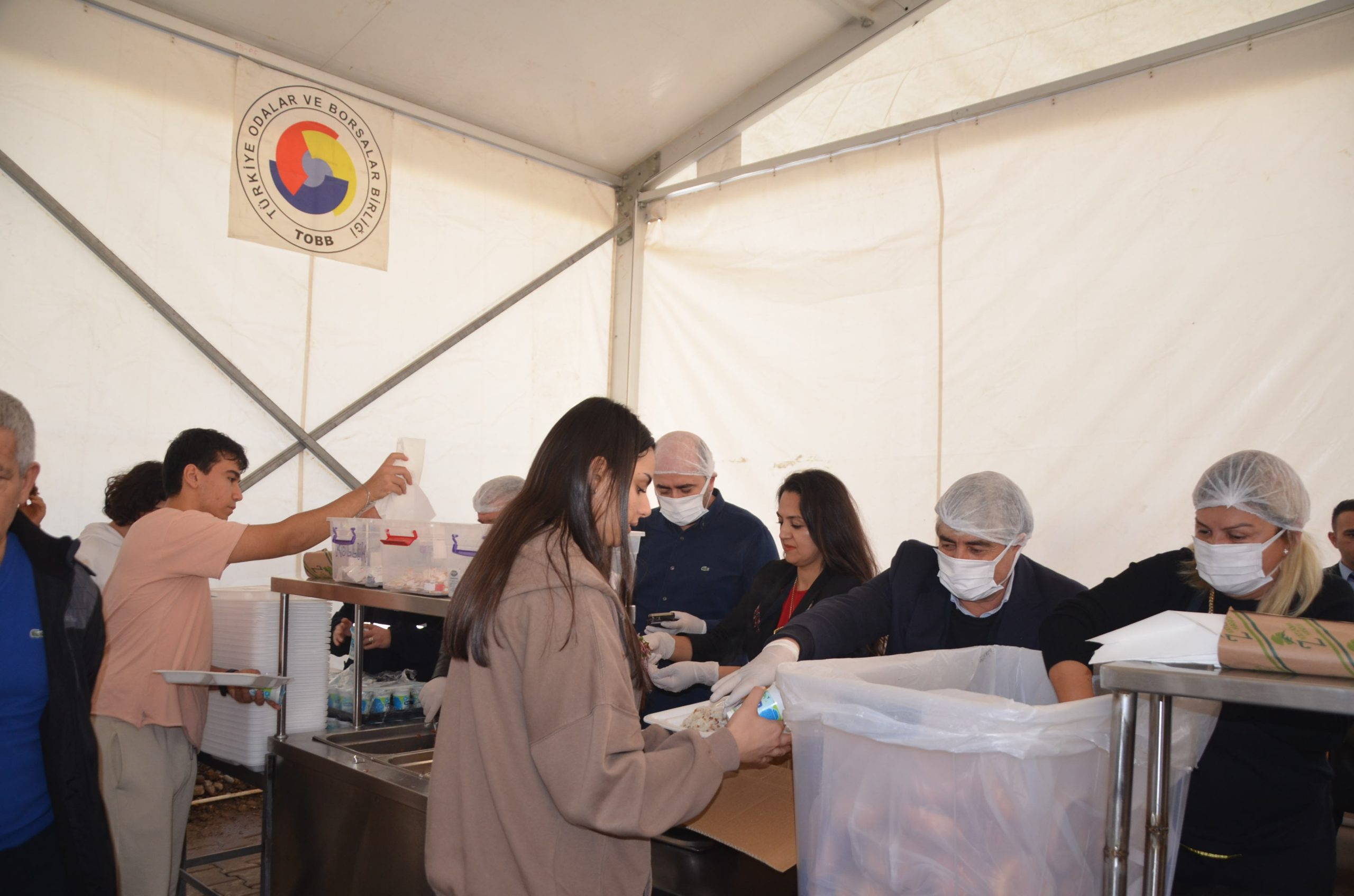 İTSO Yönetimi, TOBB çadırında öğrencilere kendi elleri ile yemek dağıttılar ve daha sonra öğrencilerle birlikte yemek yediler.