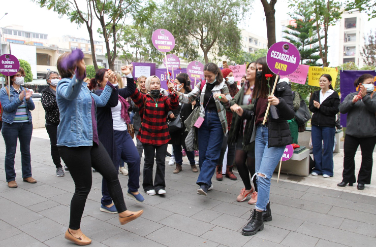 Şiddete dikkat etmek amacıyla, açıklama öncesi müzik eşliğinde, zılgıtlarla halaylar çeken kadınlar, şiddeti asla kabul etmeyeceklerini haykırdılar.