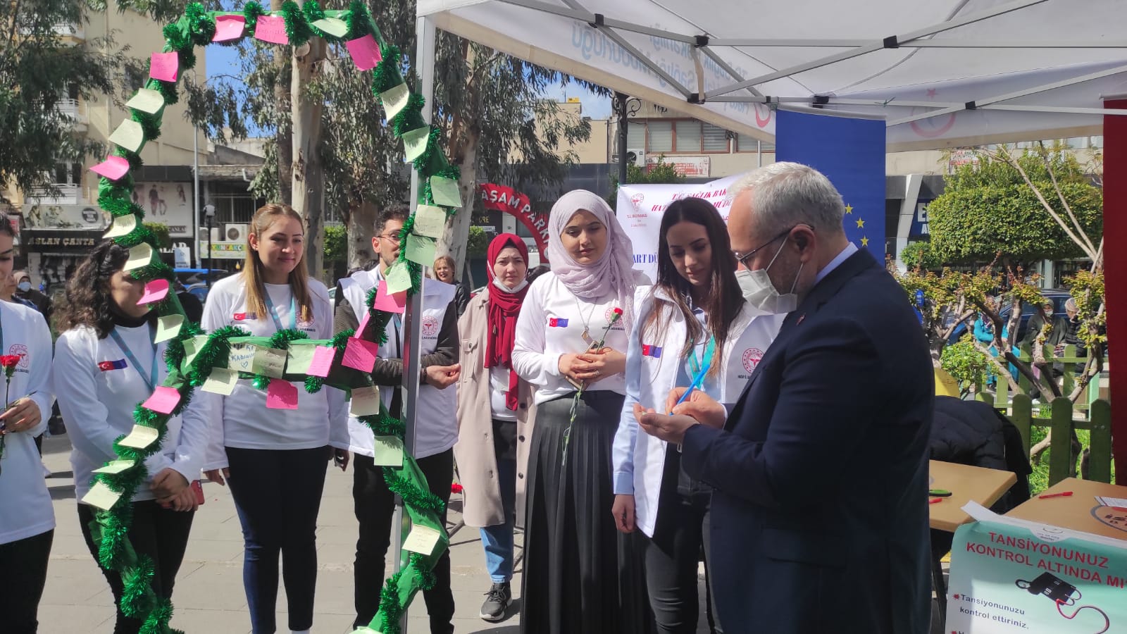 Kaymakam Yönden ve Başkan Tosyalı da, düşünce ve temennilerini kağıtlara yazarak Hayat Ağacına astılar. Ardından sağlıkçı kadınlara da karanfil dağıtarak 8 Mart Dünya Emekçi Kadınlar Günlerini kutladılar. (Haber: Helga TERBİYELİ)