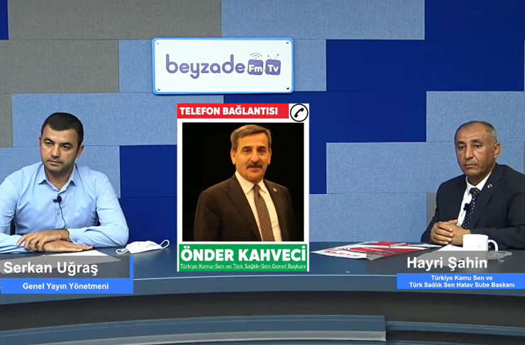 Türkiye Kamu-Sen ve Türk Sağlık Sen Hatay Şube Başkanı Hayri Şahin Beyzade FM/TV’de Serkan Uğraş’ın sunduğu Haftanın Dosyası programının canlı yayın konuğu oldu. Türkiye Kamu-Sen ve Türk Sağlık-Sen Genel Başkanı Önder Kahveci de programa telefonla bağlanarak önemli açıklamalarda bulundu. Programa telefonla katılan Kahveci, 2 Eylül’de tüm Türkiye’de meydanlarda çıktıklarını belirtti ve şunları söyledi; “11 Mart’ta ilk vakanın çıkması ile başlayan pandemi süreci hem dünyada hem de ülkemizde sağlık çalışanlarının yüklerini oldukça arttırdı. Ülkemizdeki tüm hekimlerimiz, hemşirelerimiz ve diğer sağlık çalışanlarımızın tamamı canla başla ve fedakârlıklarla çaba gösteriyorlar. Sadece evdeki yakınlarını korumak, vatandaşın sağlığını korumak ve daha etkin bir hizmet vermek için evlerine gitmediler, çocuklarını görmediler, misafirhanelerde kaldılar dolayısıyla verilen bu hizmet süresince çalışma şartlarında yaşanan sıkıntılar var, çalışanların ücretleri ve sosyal haklarında sorunlar var bu sorunları çözelim ki sağlık çalışanlarını ayakta tutalım onlara moral ve motivasyon sağlayalım ve bu sayede de sağlık hizmetlerinin verimliliğini arttırmış oluruz.”