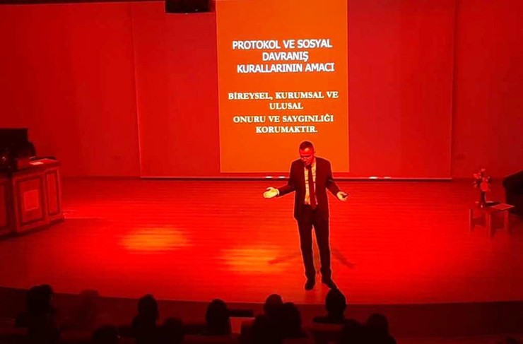 Kaymakam Sarı, iki saate yakın yaptığı sunumda protokol kurallarını bilmenin gerek bireysel, gerek kurumsal ve gerekse yerine göre ulusal onuru ve saygınlığı koruma açısından çok önemli olduğunu, yapılan bir hatanın bazen şahsi mahcubiyete yol açabileceğini, bazen kurumu zor durumda bırakabileceğini, bazen da ulusal anlamda sorunlara yol açabileceğini ifade etti. Tüm katılımcıların pür dikkat dinlediği sunumda makamda, araçta, toplantıda, davet, resepsiyon, çeşitli yer ve zamanlarda davranış biçimleri, giyim kuşam ve yeme içmeye dair kurallar detaylı bir şekilde anlatıldı.