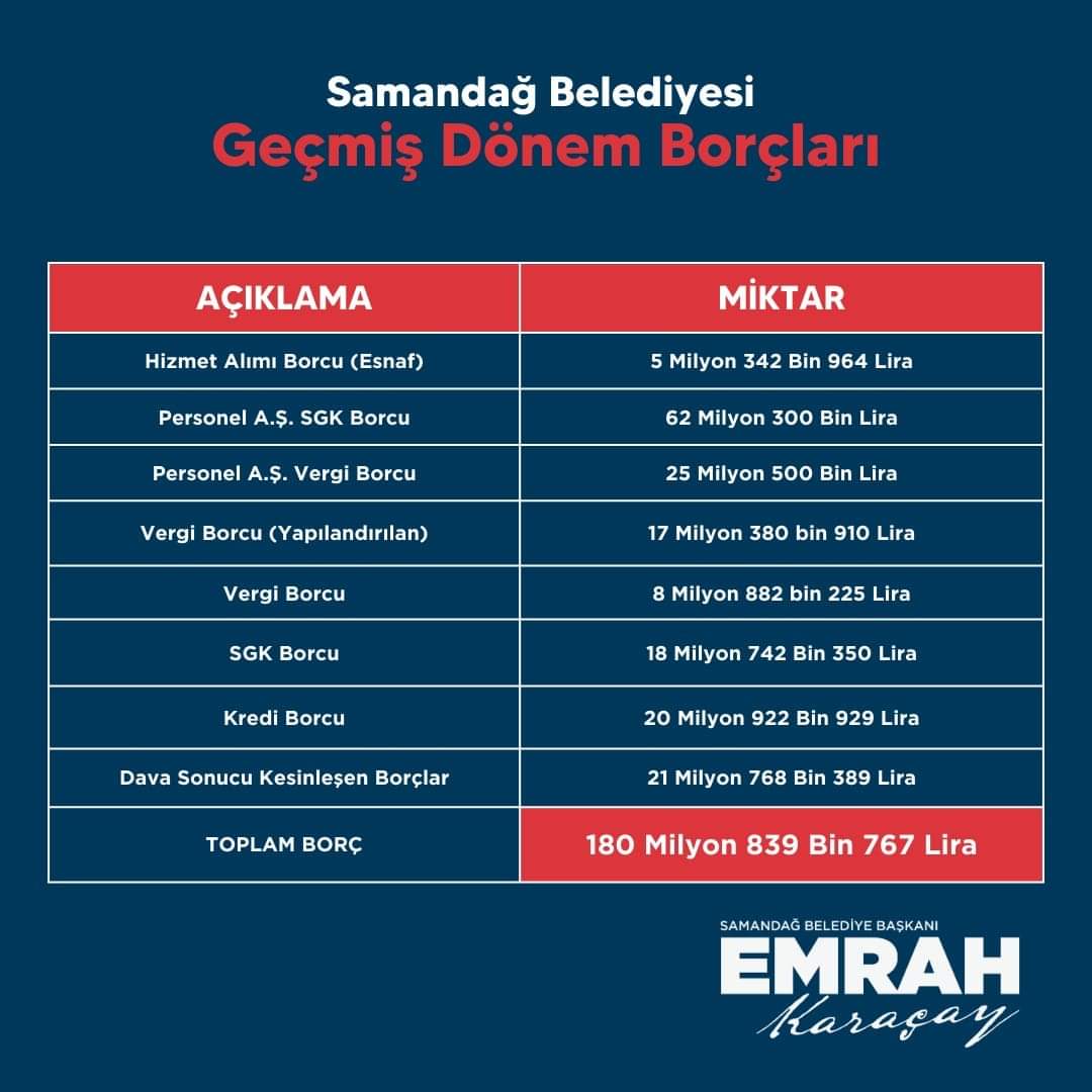 Başkan Emrah Karaçay, sosyal medya hesaplarından yaptığı açıklamada; “Değerli Samandağlılar, Sizlere söz verdiğimiz gibi şeffaflık ilkesi gereğince ilk aşamada Samandağ Belediyesi’ni teslim aldığımızdaki güncel borç durumunu tüm detayları ile açıklıyoruz. Önümüzdeki günlerde belediyemizin mevcut durumu ile ilgili farklı konularda yeni detaylı bilgilendirmeler yapacağımızı duyurmak isterim.