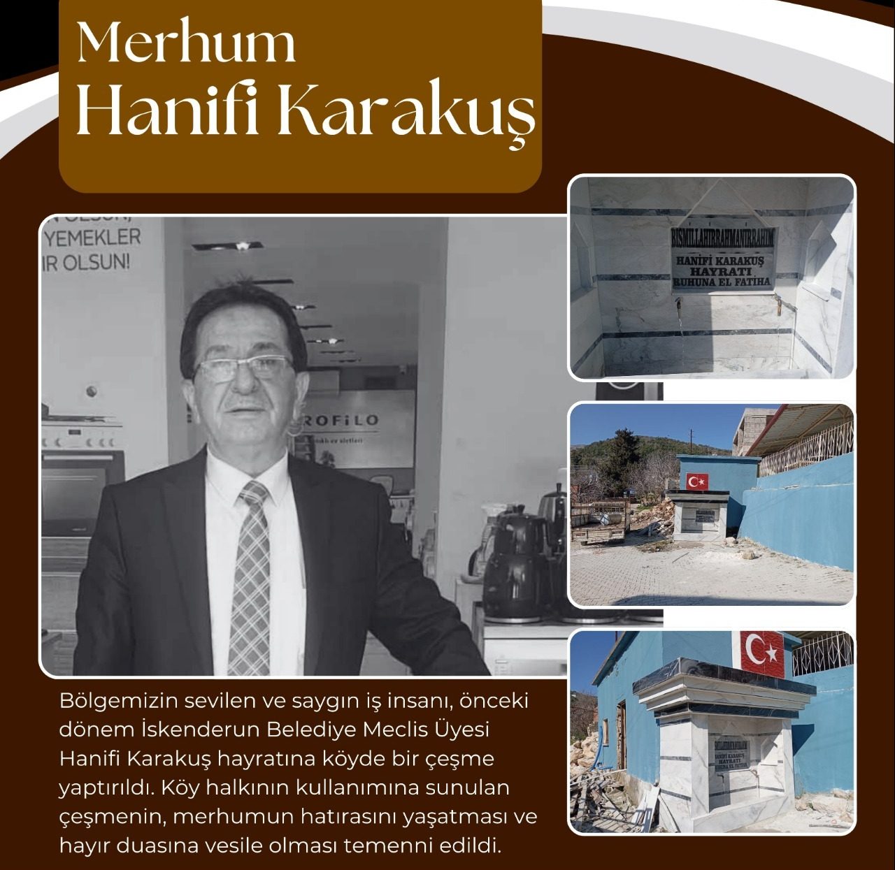 Yaşamını ve iş hayatını İskenderun’da sürdüren, önceki dönemde Belediye Meclis Üyeliği görevinde de bulunan hayırsever iş insanı Hanifi Karakuş’un vefatının ardından ailesi bir hayra imza attı. Karakuş’un ailesi memleketi Yeditepe Bezge Mahallesine Mezarlık yolu üzerinde bulunan çeşmenin bakım-onarım ve tadilatını yaparak yeniden hizmete girmesini sağladı.