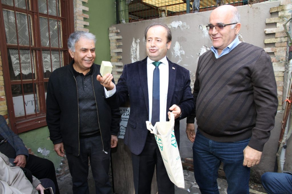 CHP Adayı Şahutoğlu’na, dernek üyeleri tarafından her yıl dernekte dökülen defne sabunu hediye edildi. (Haber: Helga TERBİYELİ)