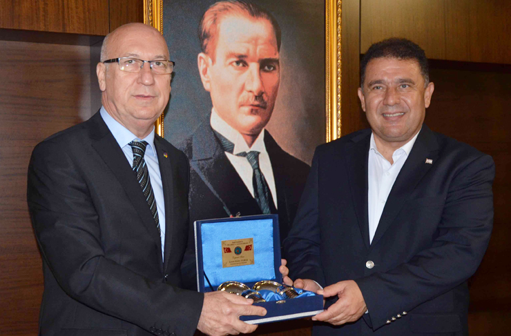 Ziyaret sonunda İTSO Başkan Yardımcısı Muhsin Yeter, KKTC Başkanı Ersan Saner’e kahve ve fincan takımından oluşan plaketi hediye ederken, KKTC Başkanı Ersan Saner’de İTSO Başkan Yardımcısı Yeter’e, Kıbrıs hatırası el işlemeli çerçeve hediye etti.