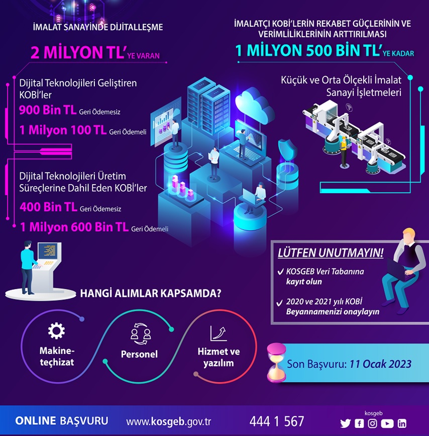 KOSGEB, 2019 yılından bu yana imalatçı KOBİ’lere yönelik olarak çıktığı ‘İmalat Sanayinde Dijitalleşme’ başlıklı çağrıların hem kapsamını genişletti hem de destek üst limitlerini arttırdı. Yeni çağrıda, dijitalleşme başlığının yanına rekabetçilik ve verimlilik modülü de eklendi. Daha önce işletme başına 1 milyon lira olan üst limit, dijitalleşme için 2 milyona çıkartıldı. Yeni ilave edilen rekabetçilik ve verimlilik başlığı için de destek üst limiti 1 buçuk milyon lira olarak belirlendi. Çağrılar kapsamında sağlanan geri ödemesiz destekler personel giderlerini, geri ödemeli destekler ise makine, teçhizat ve hizmet alımı giderlerini kapsıyor. Şartları sağlayan KOBİ’ler, 11 Ocak 2023’e kadar açık olan çağrılara başvurabilecek.