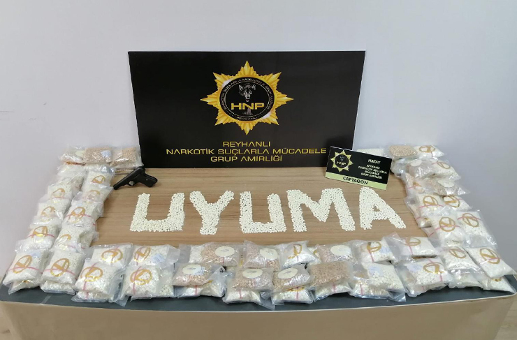 Uyuşturucu ve Uyarıcı Madde Ticareti yapan şahıslara yönelik yapılan çalışmalar neticesinde, Reyhanlı Göl kavşağında durdurulan bir araç içerisinde bulunan B.C.D. ve D.Ç. isimli şahıslar yakalandı. Şahıslardan; 6 parça halinde 6.000 adet Captagon hap, 1 adet 7×65 mm çapında ruhsatsız Browning marka tabanca, 8.000 ABD Doları ile çanta içerisinde de 90 parça halinde 90.000 adet Captagon hap ele geçirildi.