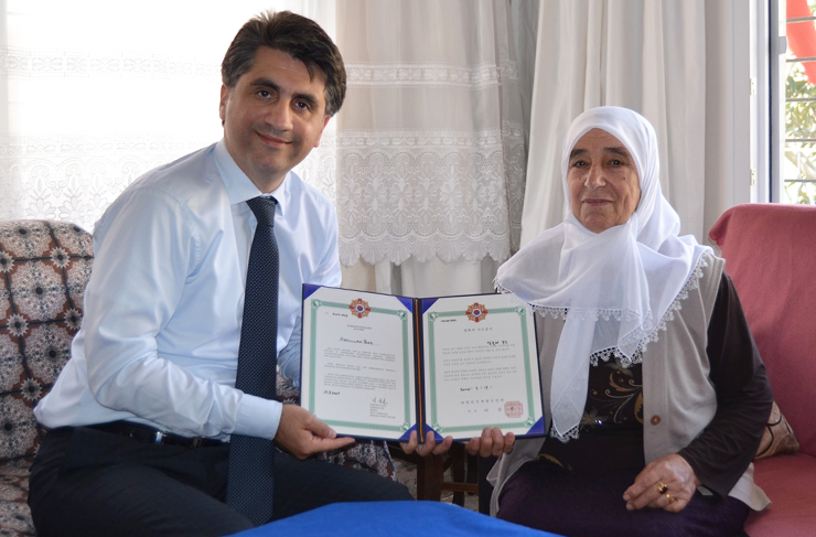 Kaymakam AYDIN; Kore Cumhuriyetinin yıllar geçmesine rağmen yapılan fedakarlığı unutmayıp örnek bir davranış sergilediğini, Kore Savaşına verilen destek dolayısıyla hem gazimize hem de Ülkemize şükranlarını bildirerek, kendisinin “Barış Büyükelçisi” olarak ilan ettiklerini belirterek, Korece ve Türkçe dillerinde kaleme alınan Berat Belgesini takdim etmekten memnuniyet duyduğunu ve merhum gazimize Allahtan rahmet dilediğini ifade etti.