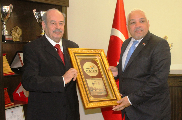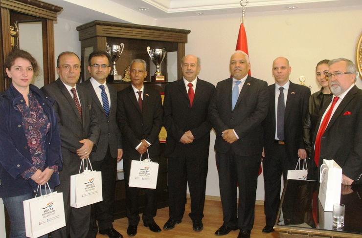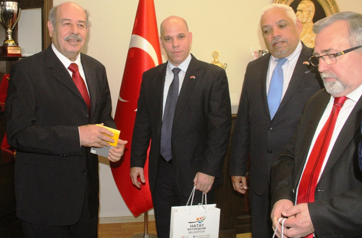 Küba Büyükelçisi Alberto Gonzalez Casals, Türk-Küba Dostluk Derneği Üyesi Tercüman Nahide Özkan, Hatay Eczacı Odası Yönetim Kurulu Üyeleri Gülsen Ertem ve Şekip Kırbeci, Mali Müşavir Mehmet Ali Yüksel ve Hatay Gönüllüleri Konseyi Komisyon Başkanı İsmail Öztürk Hatay Büyükşehir Belediye Başkan Vekili İlmittin Boz’u ziyaret etti.