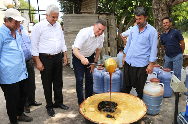 UNESCO tarafından 2017 yılında Dünyanın 26.Gastronomi Şehri ilan edilen Hatay’ın; Zengin mutfak kültüründe önemli bir yere sahip olan ve Hassa’da geleneksel usullerde üretimi yapılan Söğüt’teki pekmez maserelerinde incelemelerde bulunan HBB Başkanı Lütfü Savaş, burada pekmez üreticilerden bilgi aldı, kepçeyle pekmez savurarak, ikram edilen pekmez köpüğünden tattı.
