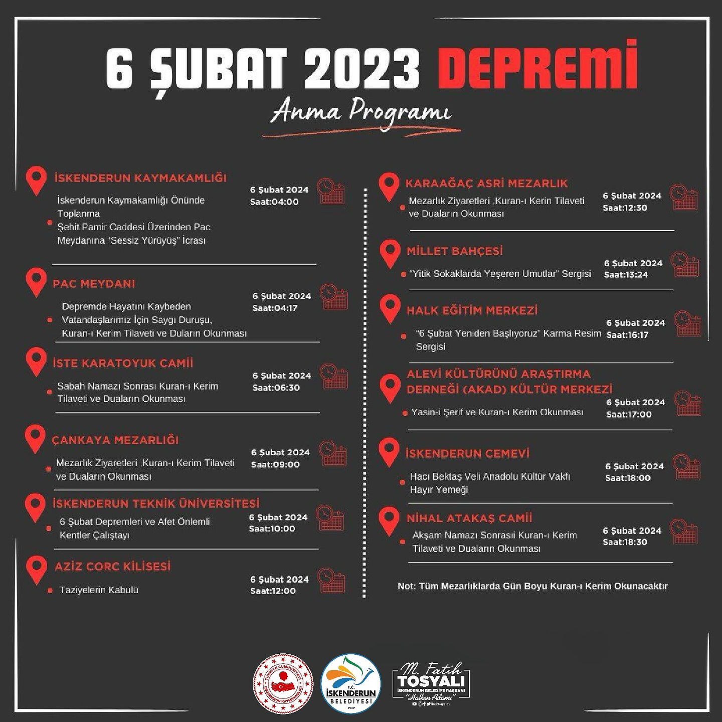 Tüm İskenderunluların davet edildiği anma programı, 6 Şubat 2024 Salı günü saat 04.00’da İskenderun Kaymakamlığı önünde toplanılarak başlayacak. Şehit Pamir cAddesi üzerinden Pac Meydanına doğru ‘Sessiz Yürüyüş’ gerçekleştirilecek ve saat tam 04.17’de Pac Meydanında depremde hayatını kaybeden vatandaşlarımız için saygı duruşunda bulunulacak, Kuran-ı Kerim tilaveti ve dualar okunacak.