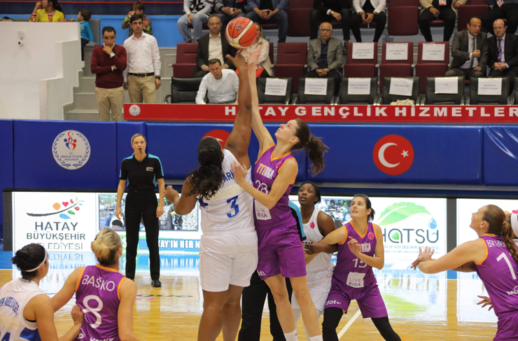 Hatay Büyükşehir Belediyesi Kadın Basketbol Takımı, EuroLeague’in ikinci hafta karşılaşmasında Letonya temsilcisi TTT Riga’yı konuk etti. Mücadeleyi 74-77’lik skorla kaybeden Hatay’ın Melekleri, Avrupa arenasındaki ilk yenilgisini de almış oldu. Temsilcimiz ilk çeyreği 21-18 önde tamamladı. Mavi-Beyazlılar, Abdelkader’in son saniyede serbest atışlardan bulduğu sayılarla da soyunma odasına 41-39 önde girdi. Başa baş ve çekişmeli geçen üçüncü çeyrek de 57-54 temsilcimizin üstünlüğü ile tamamlandı. Son çeyrek ise adeta nefesleri kesti. Savunmada adam paylaşımını iyi yapan ve hücumda yakaladığı pozisyonları değerlendiren Letonya temsilcisi, karşılaşmayı 77-74 kazandı.