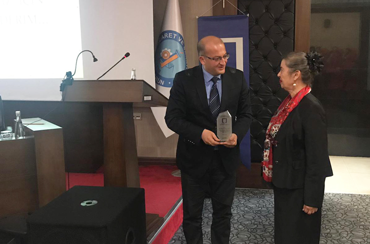 Konferans bitiminde Mimarlar Odası İskenderun Temsilciliği Yönetim Kurulu Başkanı Koray Tanın, Prof. Dr. Mimar Eser Öztaşçı Gültekin’e plaket takdiminde bulunarak, katkılarından dolayı teşekkür etti.