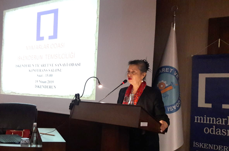 Konferans bitiminde Mimarlar Odası İskenderun Temsilciliği Yönetim Kurulu Başkanı Koray Tanın, Prof. Dr. Mimar Eser Öztaşçı Gültekin’e plaket takdiminde bulunarak, katkılarından dolayı teşekkür etti.