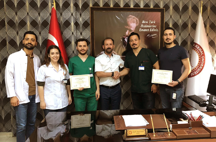 Mustafa Kemal Üniversitesi (MKÜ) Diş Hekimliği Fakültesi Ağız Diş ve Çene Cerrahisi Anabilim Dalı Başkanı Dr. Öğretim Üyesi Mert Bülte ve Araştırma Görevlileri Uğur Can Ünlügenç, Suphi Çağlar, M. Baturalp Çapraz ve Özge Aksöz 28 Nisan-02 Mayıs 2019 tarihlerinde Kıbrıs’ta gerçekleştirilen 26. Uluslararası Türk Oral ve Maksillofasiyal Cerrahi Derneği Bilimsel Kongresinde yapmış oldukları “Ateşli Silah Yaralanması ile Oluşan Maksillofasiyal Defektin Cerrahi Rekonstrüksiyonu” isimli vaka raporu çalışması ile birincilik ödülüne layık görüldüler.