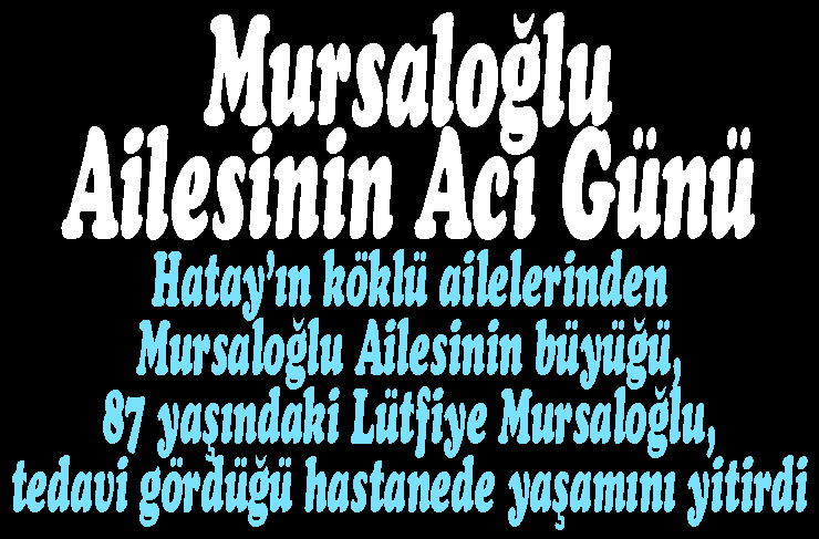 Hatay’ın köklü ailelerinden Mursaloğlu Ailesinin büyüğü, 87 yaşındaki Lütfiye Mursaloğlu, tedavi gördüğü hastanede yaşamını yitirdi. Hurşit Mursaloğlu’nun da eşi olan ve 4 kız, bir erkek çocuk annesi Lütfiye Mursaloğlu, önceki gün düzenlenen törenle toprağa verildi. Mursaloğlu’nun cenazesi önce İskenderun’daki evine getirildi ve yakınları ile komşularından helallik alındıktan sonra cenaze töreni için Kaptan Paşa Camiine götürüldü. Öğle namazına müteakiben kılınan cenaze namazının ardından Lütfiye Mursaloğlu’nun cenazesi, Karaağaç Asri Mezarlığında ailesi ve sevenlerinin gözyaşlarıyla toprağa verildi.