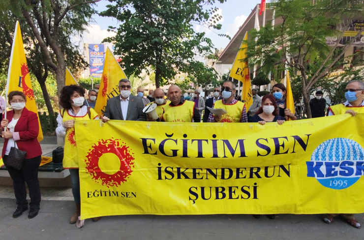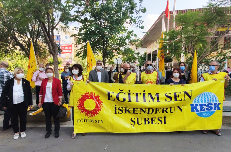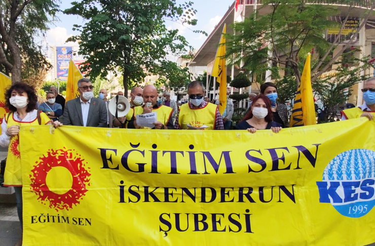 Eğitim-Sen İskenderun Şube Başkanı Mustafa Ünsal, sendika üyelerinin de katılımıyla gerçekleştirilen basın açıklamasında; depremden Pandemi sürecine, görevine son verilen kamu emekçilerinden pandemi sürecinde eğitim alanında yaşanan veya yaşanacak olan sorunlara kadar birçok konuda değerlendirmelerde bulundu.