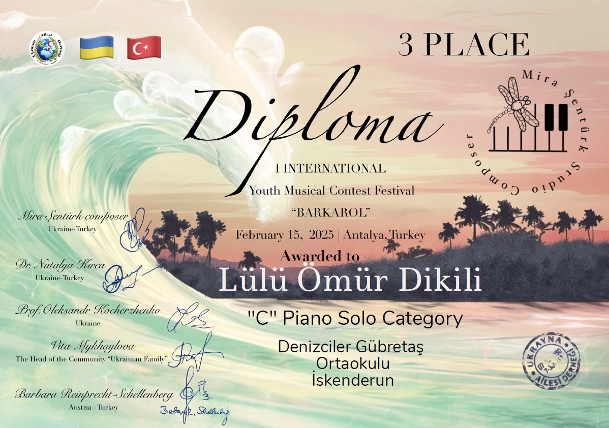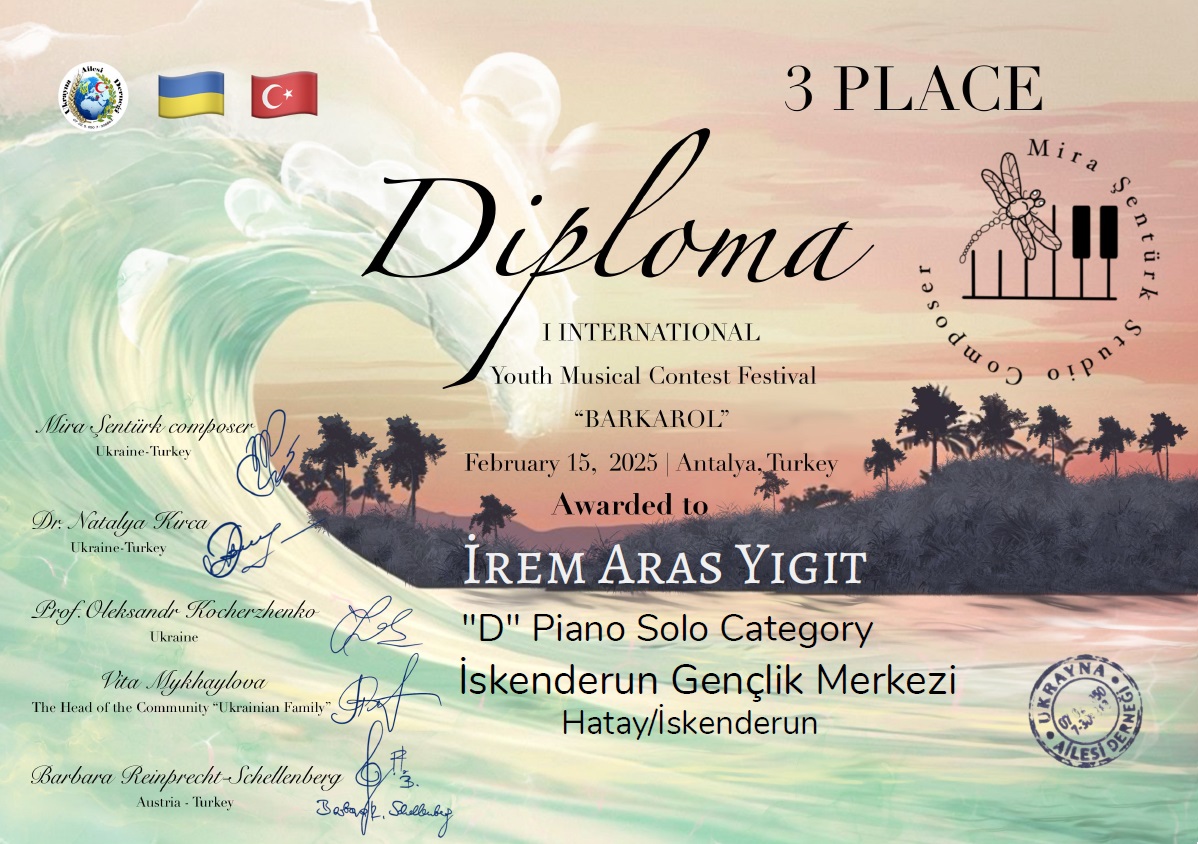 Ukrayna Ailesi Derneği tarafından düzenlenen Uluslararası Enstrümantal Müzik “Barkarol” (Musical Contest Barkarol) Yarışmasının beş jürisi de akademisyenlerden oluşmaktaydı. Uluslararası olması sebebiyle katılımın çok olduğu böylesine zorlu bir yarışmada aldıkları derece ile Yiğit ve Dikili, başta ailelerini, eğitmenlerini, İskenderun Gençlik Merkezi’ni ve temsil ettikleri İskenderun ilçemizi gururlandırdı.