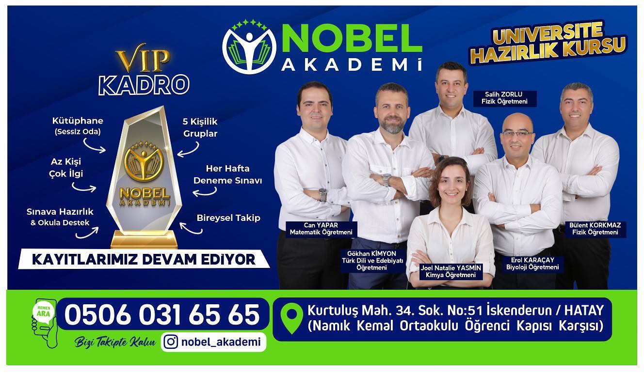 Biyoloji Öğretmeni Erol Karaçay, Matematik Öğretmeni Can Yapar, Kimya Öğretmeni Joel Natalie Yasmin, Fizik Öğretmeni Salih Zorlu, Fizik Öğretmeni Bülent Korkmaz ve Türk Dili ve Edebiyatı Öğretmeni Gökhan Kimyon ortaklığında eşit ağırlık ve sayısal alanlarında hizmet vermek üzere 2023-2024 eğitim öğretim yılında kapılarını öğrencilere açan Nobel Akademi, üstlendiği misyon, deneyimli eğitim kadrosunun verdiği güven ile üçüncü yılında fark yaratan eğitim kurumlarından biri oldu.