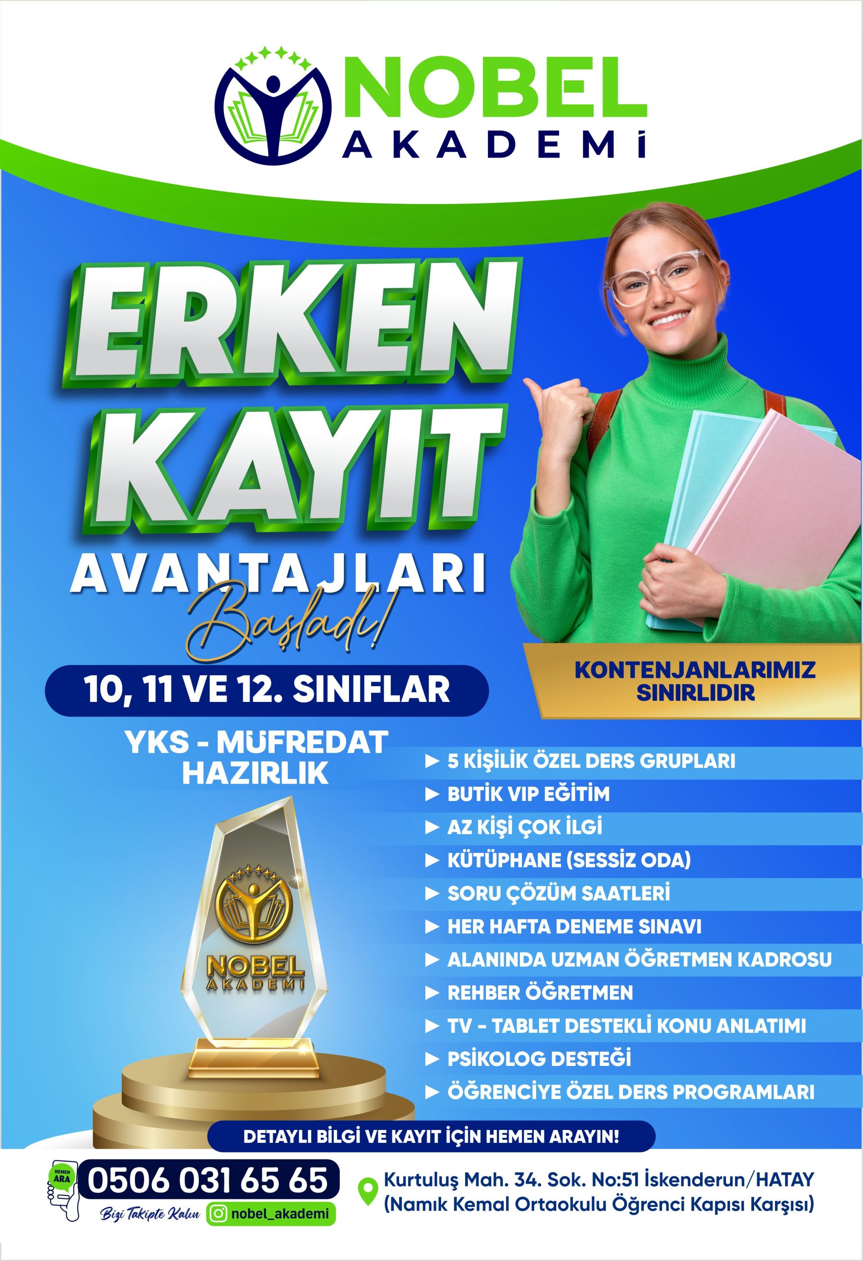 Başarı odaklı eğitim anlayışıyla adından söz ettiren Nobel Akademi, 10, 11 ve 12. sınıf öğrencilerine özel erken kayıt avantajlarını başlattı. YKS hazırlık sürecini sistemli, disiplinli ve öğrenci merkezli bir yaklaşımla yürütmeyi hedefleyen kurum, sınırlı kontenjanla kabul ettiği öğrencilerine ayrıcalıklı bir eğitim deneyimi sunuyor.