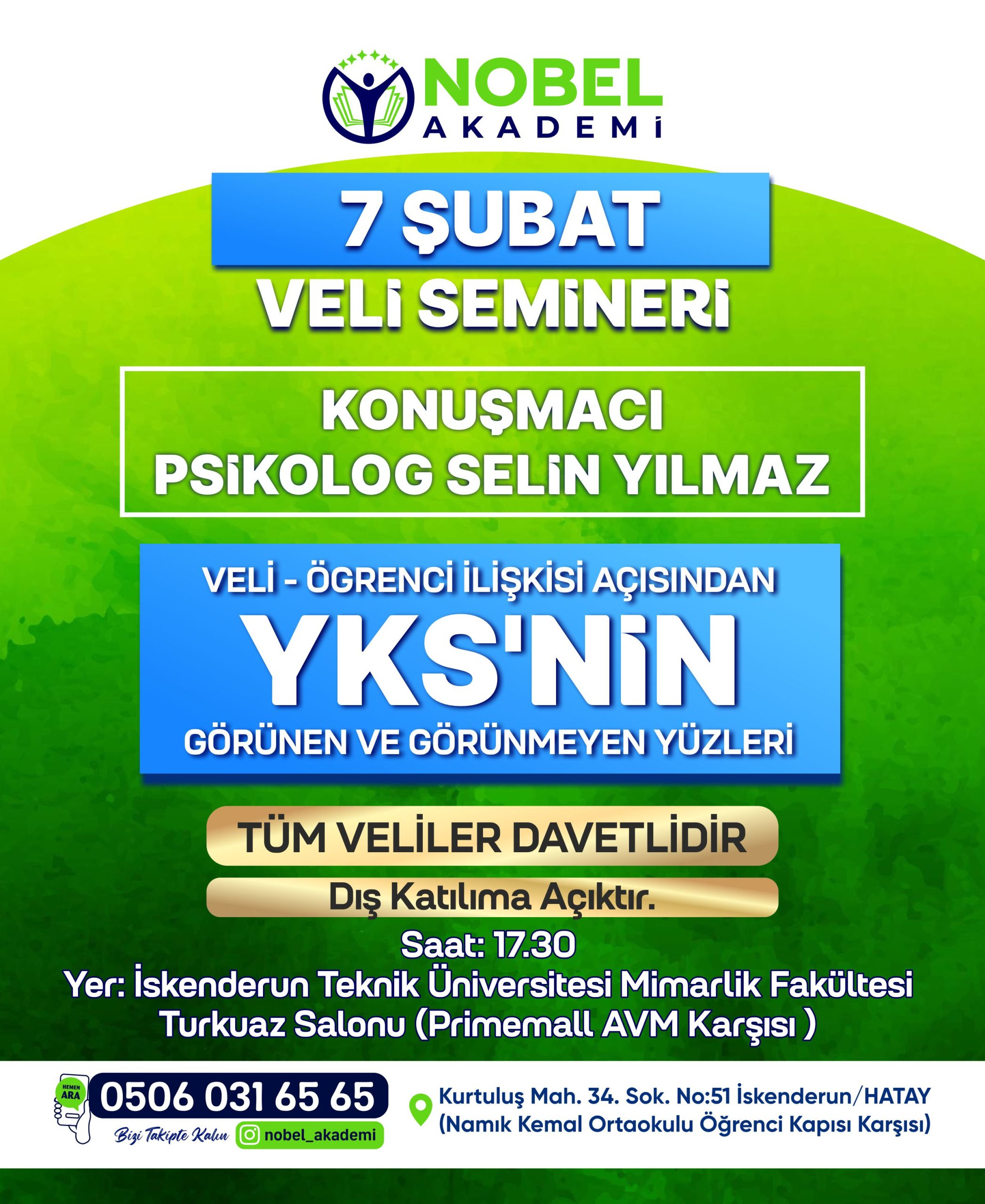 Nobel Akademi tarafından, 7 Şubat 2026 Cumartesi günü,  önümüzdeki Haziran ayında yapılacak olan üniversite sınavlarına hazırlık süreci ile ilgili ‘Veli Semineri’ gerçekleştirilecek. Seminere Psikolog Selin Yılmaz konuşmacı olarak katılacak.