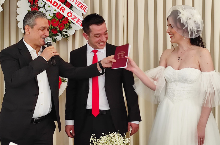 Nikah şahitlerinden Belen Belediye Başkan İbrahim Gül, gerçekleştirilen nikah sonrası genç çiftlere mutluluklar dilerken, nikah cüzdanını da gelin hanıma verdi.