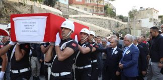 Gaziantep’te şüpheli bir motosikleti kovalarken kaza yaparak görevi başındayken şehit olan Hataylı Polis Memuru Emirhan Şimşek’in Türk bayrağına sarılı naaşı, Gaziantep Çevik Kuvvet Şube...
