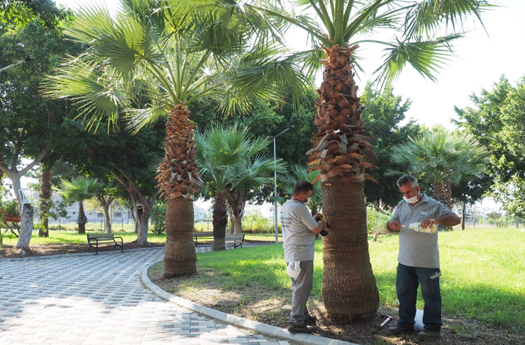 Hatay Büyükşehir Belediyesi Park Bahçe ve Yeşil Alanlar Daire Başkanlığına bağlı ekipler, palmiye ve hurma (phoenix) ağaçlarının gövdelerinde çoğalarak ölümcül zararlar veren palmiye kırmızı böceğine karşı biyolojik mücadele başlattı.
