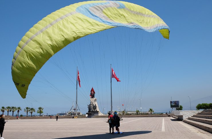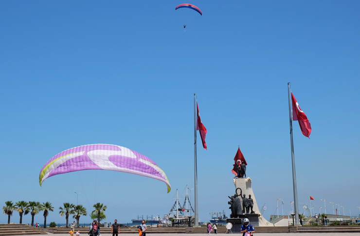 Çelenk sunumunun ardından kutlamalar çerçevesinde Amanos Dağları zirvesinden Türk bayraklarıyla yamaç paraşütü gösterisi gerçekleştirildi. (Haber Merkezi)