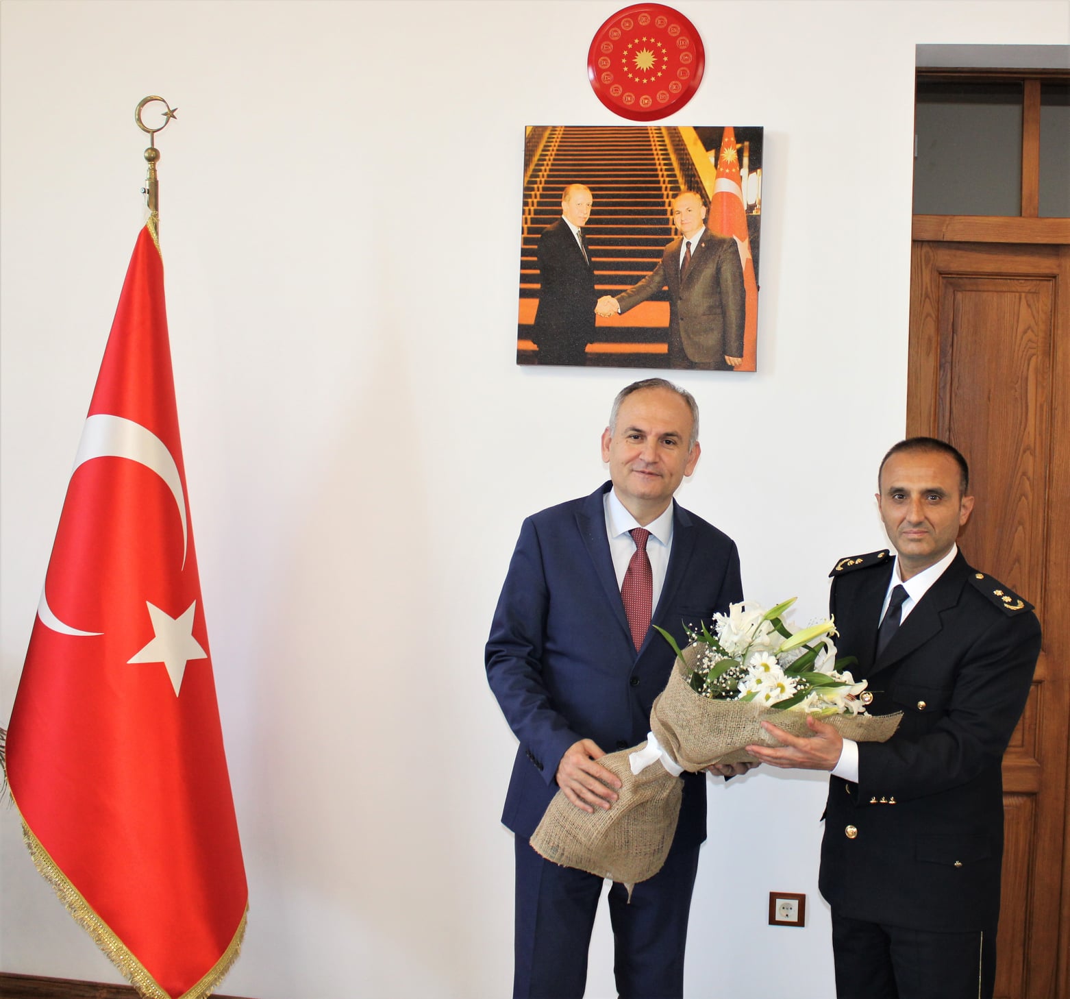 İlçe Emniyet Müdürü Güneş ile beraberindekiler, Kaymakam İskender Yönden’e ziyaretleri esnasında çiçek takdim ettiler. (Haber Merkezi)