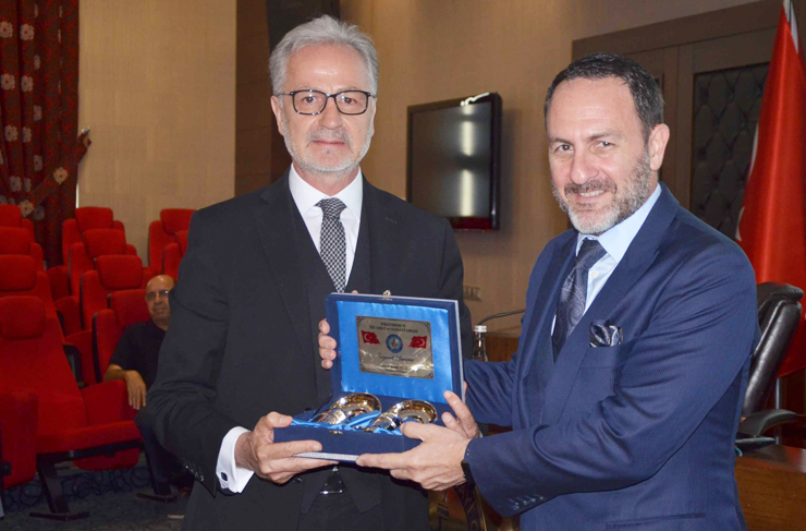Daha sonra sunumuna başlayan Prof. Dr. Emre Alkin ise yaptığı açıklamasında; “Teknolojinin hızla geliştiği ve artık elektronik ortamda ticaretlerin yapıldığı, Endüstri 4.0’dan sonra Endüstri 5.0’ın konuşulduğu günümüzde Fiyat, üretim ve dolaşım alanı arasındaki çelişkide kim daha güçlü ise onun yönlendirmesi ile fiyatlar oluşmaktadır. Teknoloji üretimi ve teknoloji yatırımında atılım ve cesaret çok önem arz etmektedir. Günümüzde artık yatırım ve istihdamdan ziyade dünyada çok büyük gelirler elde eden ve bu gelirlerini teknoloji sayesinde kuran firmalar dünya piyasalarında söz sahibi olmuşlardır. Buna örnek verecek olursak, dünyanın en önemli kaynağı artık petrol değil veri tabanı (Data) olmuştur. Önümüzdeki 10 yıl içerisinde 5 risk beklenmektedir. Bunlar Nükleer savaş, Doğa olayları, Doğal afetler, su krizleri önemli etkenler arasında yer alacaktır” dedi.