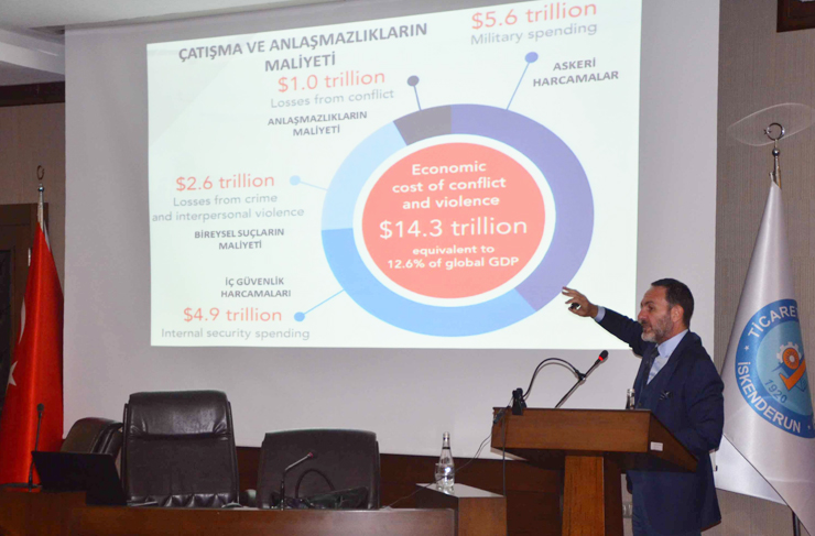 Daha sonra sunumuna başlayan Prof. Dr. Emre Alkin ise yaptığı açıklamasında; “Teknolojinin hızla geliştiği ve artık elektronik ortamda ticaretlerin yapıldığı, Endüstri 4.0’dan sonra Endüstri 5.0’ın konuşulduğu günümüzde Fiyat, üretim ve dolaşım alanı arasındaki çelişkide kim daha güçlü ise onun yönlendirmesi ile fiyatlar oluşmaktadır. Teknoloji üretimi ve teknoloji yatırımında atılım ve cesaret çok önem arz etmektedir. Günümüzde artık yatırım ve istihdamdan ziyade dünyada çok büyük gelirler elde eden ve bu gelirlerini teknoloji sayesinde kuran firmalar dünya piyasalarında söz sahibi olmuşlardır. Buna örnek verecek olursak, dünyanın en önemli kaynağı artık petrol değil veri tabanı (Data) olmuştur. Önümüzdeki 10 yıl içerisinde 5 risk beklenmektedir. Bunlar Nükleer savaş, Doğa olayları, Doğal afetler, su krizleri önemli etkenler arasında yer alacaktır” dedi.