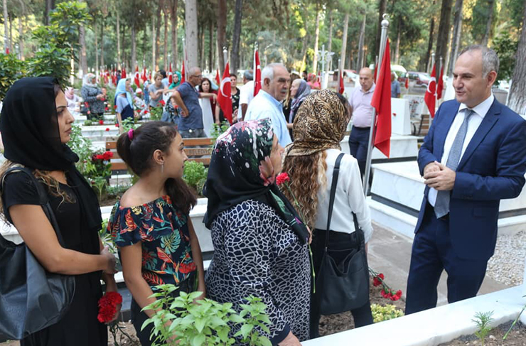 Kurban Bayramı dolayısıyla ilk olarak aziz şehitlerimiz ziyaret edildi. Arife günü gerçekleştirilen Şehitlik ziyareti programına katılan protokol üyeleri, şehitlerin kabrine karanfil bırakarak, şehit ailelerinin acısını paylaştı.