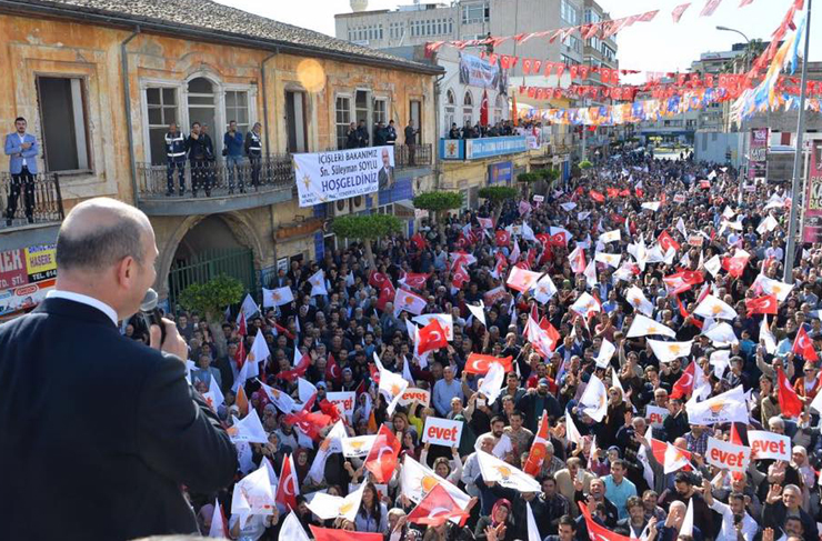 Ak Parti İskenderun İlçe binası önünde halka hitap eden Bakan Soylu, Anayasa Değişikliğinin getireceklerini anlattı. 1961 ve 1982 anayasalarını eleştiren Bakan Soylu; “61 Anayasasıyla darbe üretiyorlar, ekonomik kriz üretiyorlar, milleti hiçe sayıyorlar. Her gün bizi ötekileştirmeye çalışıyor, işine geldiklerini kullanıyorlar. 16 Nisan referandumu, yıllardır bu milletin ensesinde boza pişirenlere karşı ‘bu topraklar, bu vatan, bu karar ve bu söz milletindir’ diye ortaya koyduğumuz haykırışın adıdır. Bu yüzden ‘Evet’ diyoruz” şeklinde konuştu.