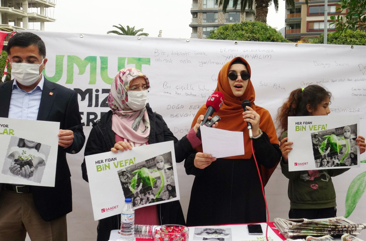 Saadet Partisi Hatay İl Kadın Kolları Başkanı Ceren Seda Çiçek burada yaptığı basın açıklamasında; “Doğadaki tahribat, açılan yara gittikçe derinleşti. Ancak biz bu yarayı birlikte sarabileceğimize, doğayı hep birlikte yeniden onarabileceğimize inanıyoruz. Yanan ormanlarımızı, mahvedilen doğayı hep birlikte yeniden yeşerteceğimizi umut ediyoruz. Bu farkındalıkla, Saadet Partisi Kadın Kolları olarak, kurmak istediğimiz, Necmettin Erbakan-Umut Ormanı ile doğamızda ve sosyal hayatımızda kaybettiğimiz değerleri el birliği ile yeniden kazanacağımıza ve böylelikle yarınlara daha güzel bir ülke bırakacağımıza inanıyoruz” dedi.