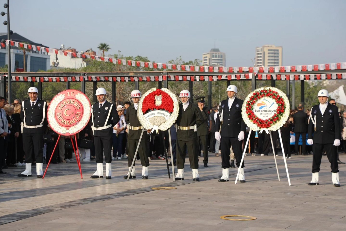 İskenderun Anıt Alanı’nda düzenlenen tören, çelenk sunumuyla başladı. Atatürk Anıtı’na İskenderun Kaymakamlığı, Garnizon Komutanlığı ve İskenderun Belediyesi çelenklerinin sunulmasının ardından, saat 09.05’te sirenler eşliğinde iki dakikalık saygı duruşunda bulunuldu ve İstiklal Marşı okundu.