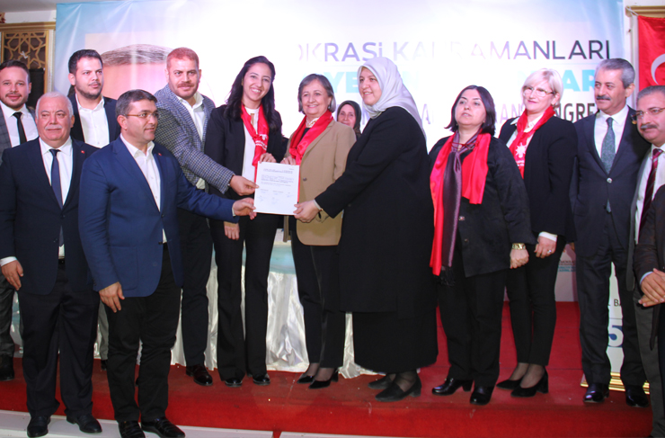 Yeniden başkan olan Sabahat Özgürsoy Çelik mazbatasını, İstanbul Milletvekili TBMM Dilekçe Komisyonu Başkanı M. Belma Satır ve Ak Parti Genel Merkez Kadın Kolları MKYK üyesi, Teşkilat Başkan Yardımcısı Emel Anlar’ın elinden aldı.