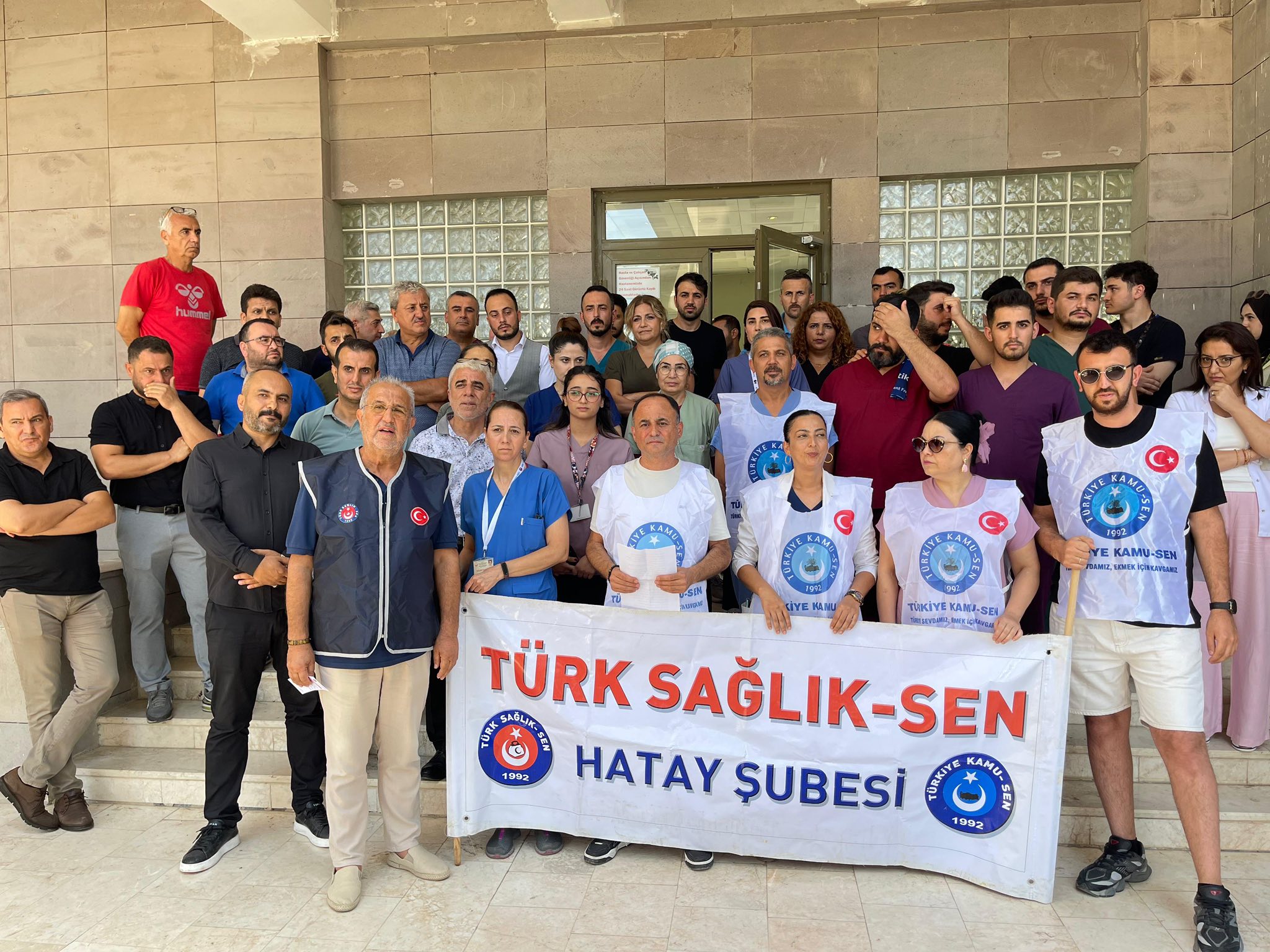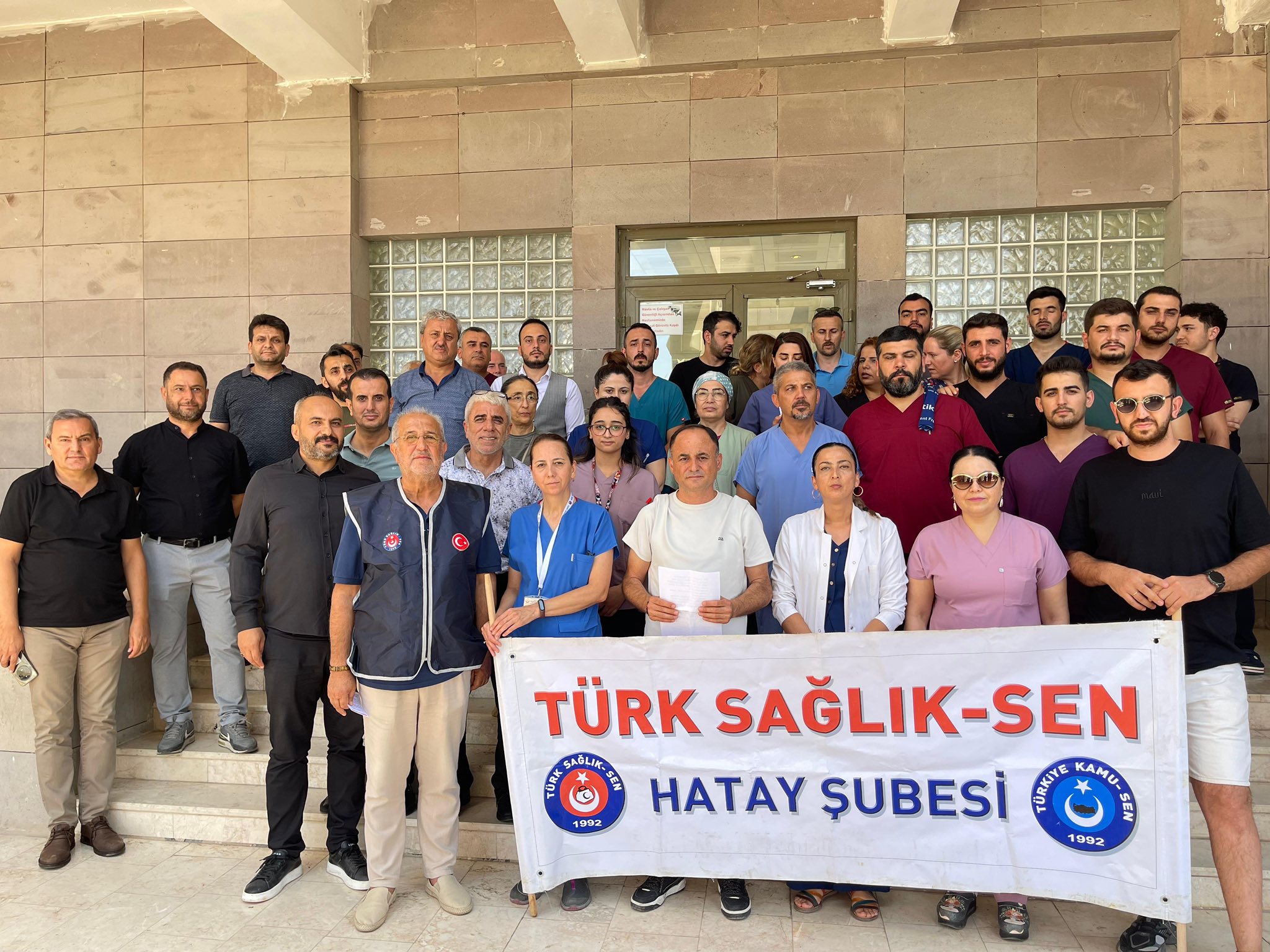 İskenderun Devlet Hastanesi önünde Genç Sağlık-Sen Hatay 2 Nolu Şubesi, Türk Sağlık-Sen Hatay Şube ile SES İskenderun Temsilciliği, sağlık çalışanları, hekimler ve üyeleriyle birlikte sağlık çalışanına şiddete, tepkilerini basın açıklamasıyla dile getirdi.
