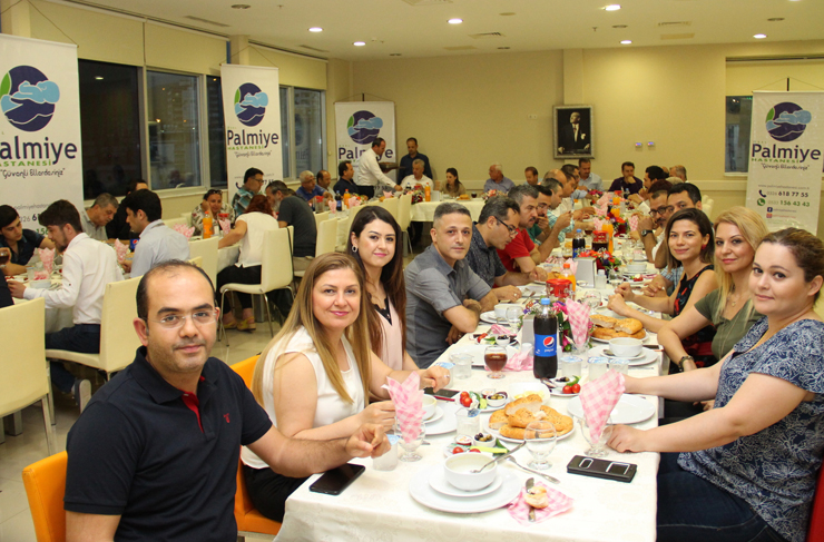 İskenderun Özel Palmiye Hastanesi yönetimi tarafından geleneksel hale getirilen iftar yemeğine Palmiye Hastanesi Yönetim Kurulu Başkanı Cemil Kirmit, Başhekim Yılmaz Şahutoğlu, yönetim kurulu üyeleri Serdar Kirmit ve Seval Kirmit Yazar, doktor kadrosu ile basın mensupları katıldı.