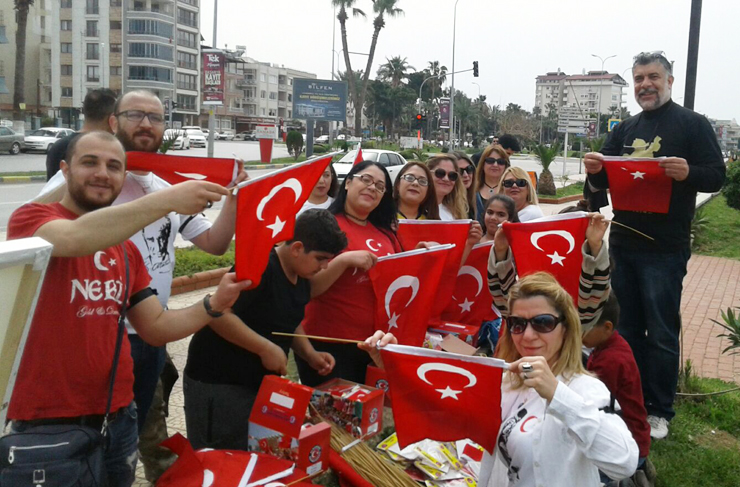 Kurulduğu günden bu yana Atatürk, Cumhuriyet ve Bayrak temalı birçok etkinliği başarı ile hayata geçiren Sarı Zeybekler Derneği geniş katılımlı bir bayrak yürüyüşü yaparak şehitlere ve Mehmetçiklere karşı olan görevlerini yerine getirdiler.