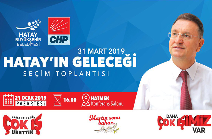 31 Mart 2019 yerel seçimlerinde Cumhuriyet Halk Partisi’nden yeniden Büyükşehir Belediye Başkan adayı olan Hatay Büyükşehir Belediye Başkanı Doç. Dr. Lütfü Savaş, 21 Ocak Pazartesi günü (bugün) saat 16.00’da HATMEK Konferans Salonunda ‘31 Mart 2019 Hatay’ın Geleceği’ adlı seçim toplantısında hemşerileri ile buluşacak.